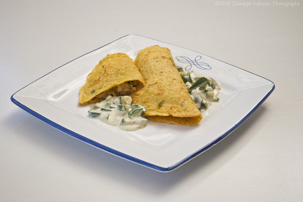 The dish prepared today is not so elaborate as it can appear. They are crêpes made of chickpeas flour, filled with small shrimps and sautéd zucchini gently mixed with a couple of spoons of soured cream.
