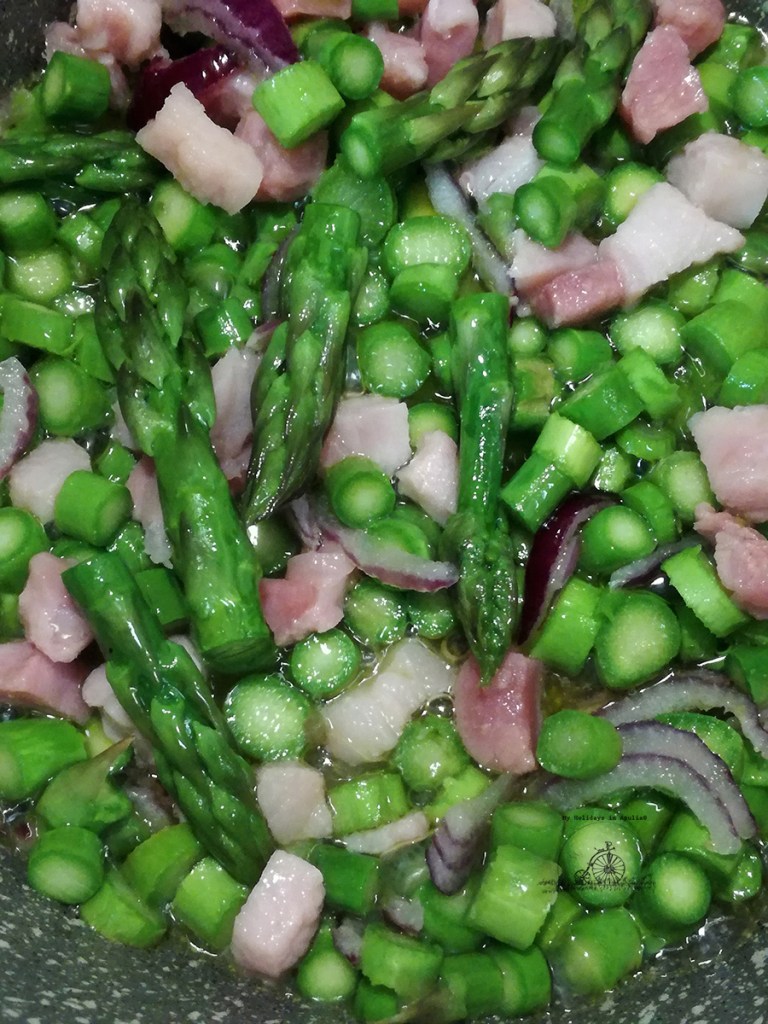 Starting from the bouillon, I chopped eight (n.8) fresh green sparrows and started frying them gently in a sauce pan with a couple of soup spoons of extra virgin olive oil, small cubes of bacon, sliced onion and an idea of garlic. Five minutes later, I added some water (about half level of the sauce pan), three or four cherry tomatoes, a sprinkle of black pepper and little sea salt, covered the sauce pan with a lid and kept the bouillon cooking and boiling slowly for 30 or 40 minutes.