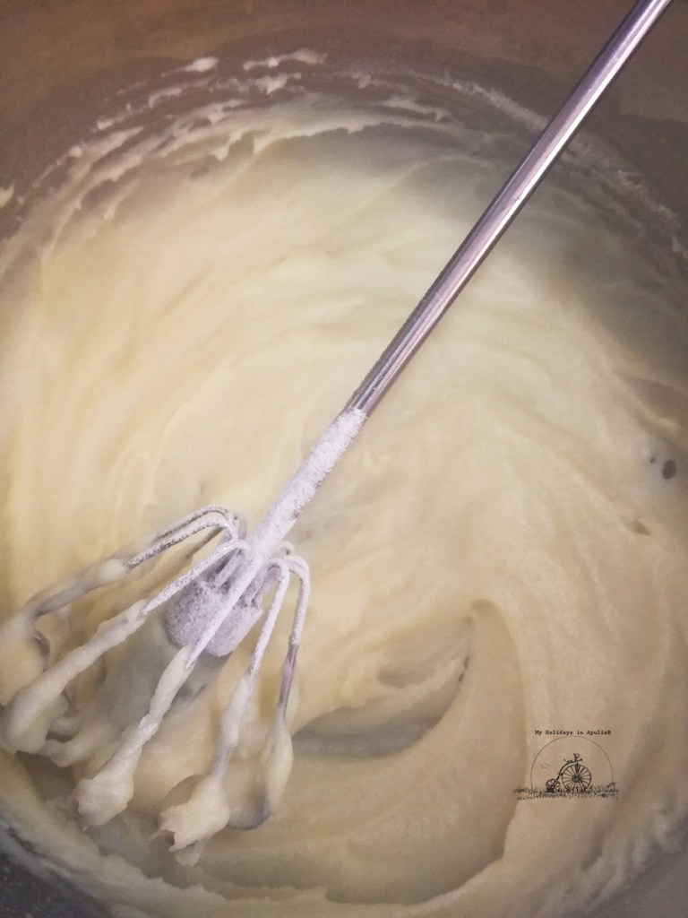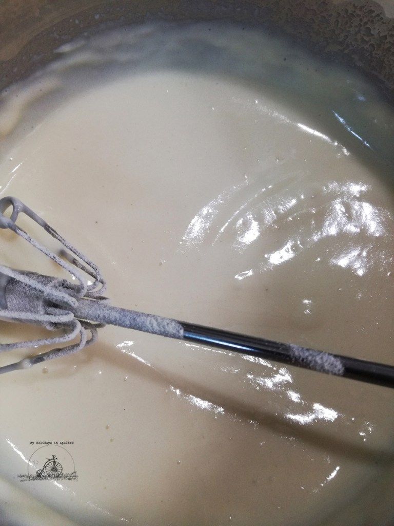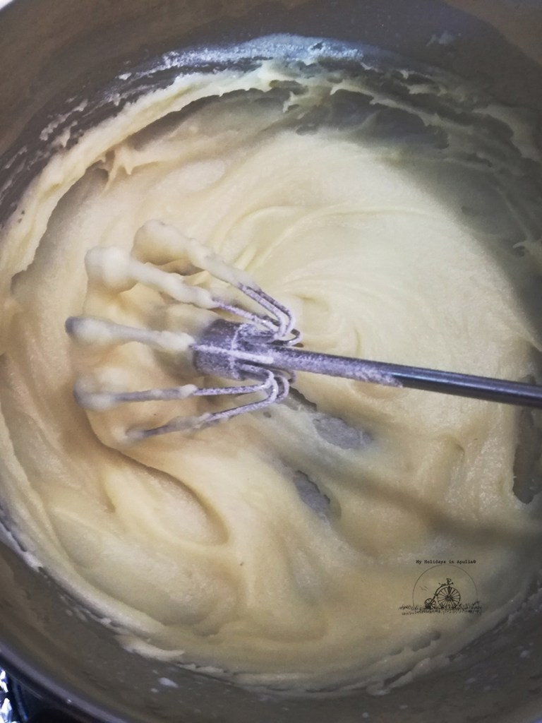 As for the home made semolina gnocchi, in a large pan, I poured 250 ml of milk (ingredients are for one person), let it boiling and then, slowly, I added 75 gr of semolina flour, a sprinkle of salt, and kept mixing and stirring in order to have a smooth velvet mixture with no clots, which, after (more or less) 20 minutes got well thick.