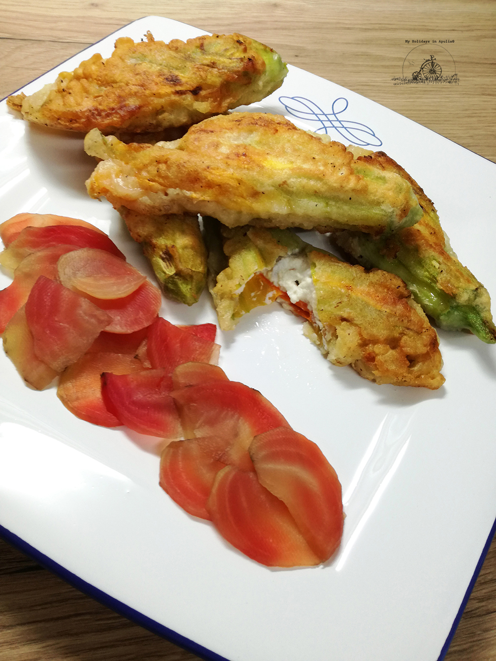 Soon it's gonna be Summer again and we love staying in the open air, living the cosy moments of conviviality with family and friends around a table or, even better, sitting on the grass for enjoying a picnic. At this proper, stuffed zucchini flowers, fried and served warm, might be an inviting and very welcome appetizer. Here to follow we have got the ingredients and few steps for the execution of the dish.