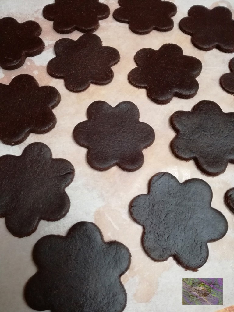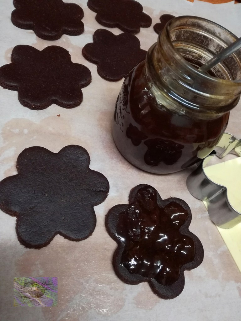 Start with the vanilla short pastry. Help yourself with a rolling pin and greaseproof paper and get a thin (2-3mm) layer. Make small daisies with a mould and spread “nutella” cream on the surface of the daisy, then cover it with an other daisy. Do the same work with the cocoa version of daisies, spreading their surface with apricot jam. The daisies go in the 170°C oven for 10/12 minutes.