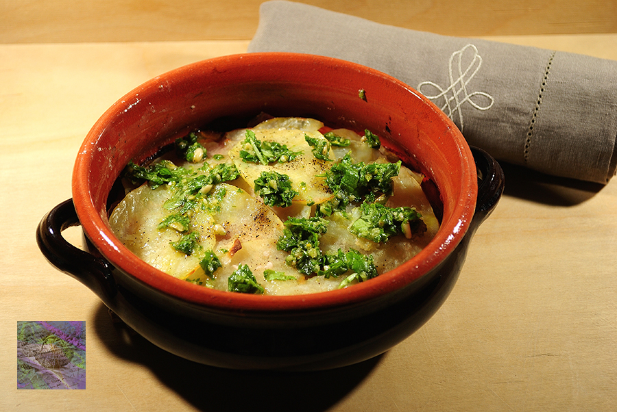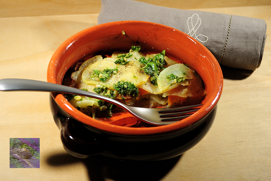 Now, for enjoying a cosy Autumn dinner, let’s prepare few simple ingredients for a “millefoglie” made of green. For this dish, we need some potatoes, zucchini, carrots, salt and pepper, some butter, brie cheese, leaves of basil, pine kernels, extra virgin olive oil.