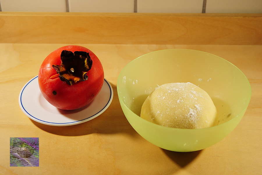 Besides, there was a delicious smell of short pastry coming straight from the kitchen. Indeed, I mixed and worked the ingredients very quick and left the short pastry to rest in the fridge for about half an hour. In the meanwhile, I also grilled slices of fresh persimmon.