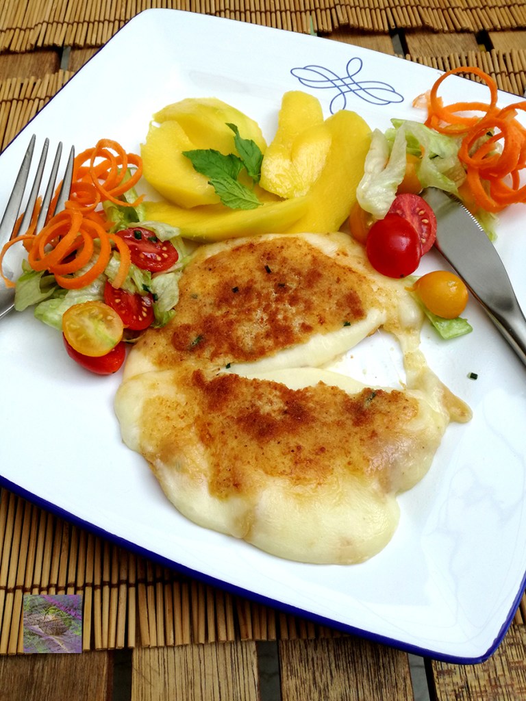 It is the Midsummer weekend and in Apulia temperatures are around 40°C! To drink more water, having fresh vegetables and fruit is the best way to feel good. Here we have one more delicious salad, which invites by saying “eat me!” Indeed, few, simple ingredients make a feast in the dish. We prepared the salad with cherry tomatoes, carrots, lettuce, chives, mango, mint and we served it with generous slices of local warm melting scamorza cheese, which previously sank twice into the egg and into breadcrumbs before being slightly fried into few drops of extra virgin olive oil. In the end, add a drizzle of extravirgin olive oil or balsamic vinegar on top and enjoy the dish and beautiful company!
