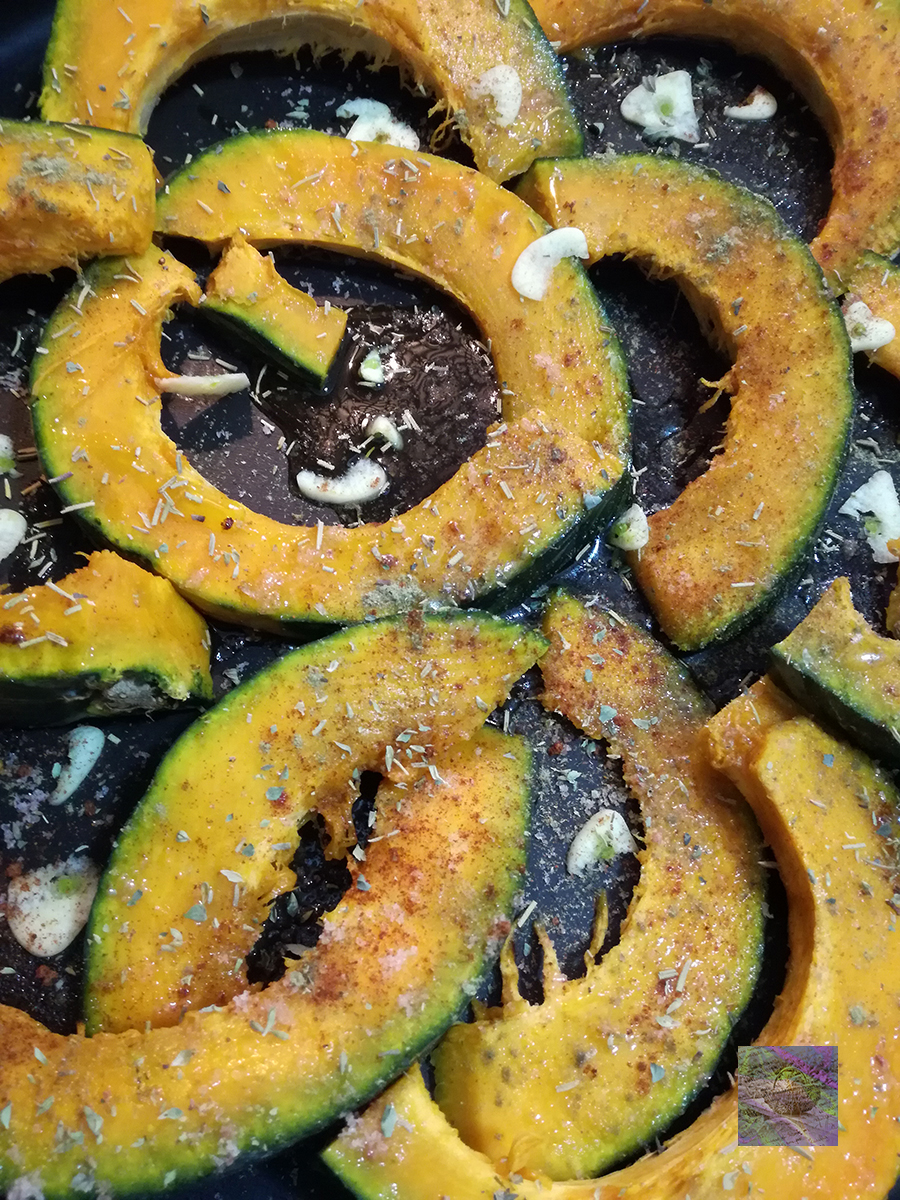 Make slices of pumpkin and roast them very quick in the oven (about 15 min, 160/180°C) simply with few drops of extravirgin olive oil, herbs like rosemary, oregano, marjoram, thyme, a pinch of pepper, Himalayan pink salt and an idea of garlic here and there.