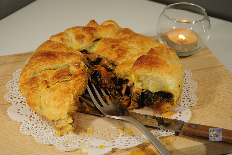 The mashed roasted pumpkin is also an excellent ingredient for the puff pastry pie, but, for this second dish, add also Portobello mushrooms (which have been previously sautéed in extravirgin olive oil with little garlic and a generous handful of parsley), small bites of fresh mozzarella and cubes of mortadella Bologna in the filling. The crisp puff pastry pie cooks very quick in the oven (180°C) and it is an appetizing warm idea to serve to your family or friends at dinner time.