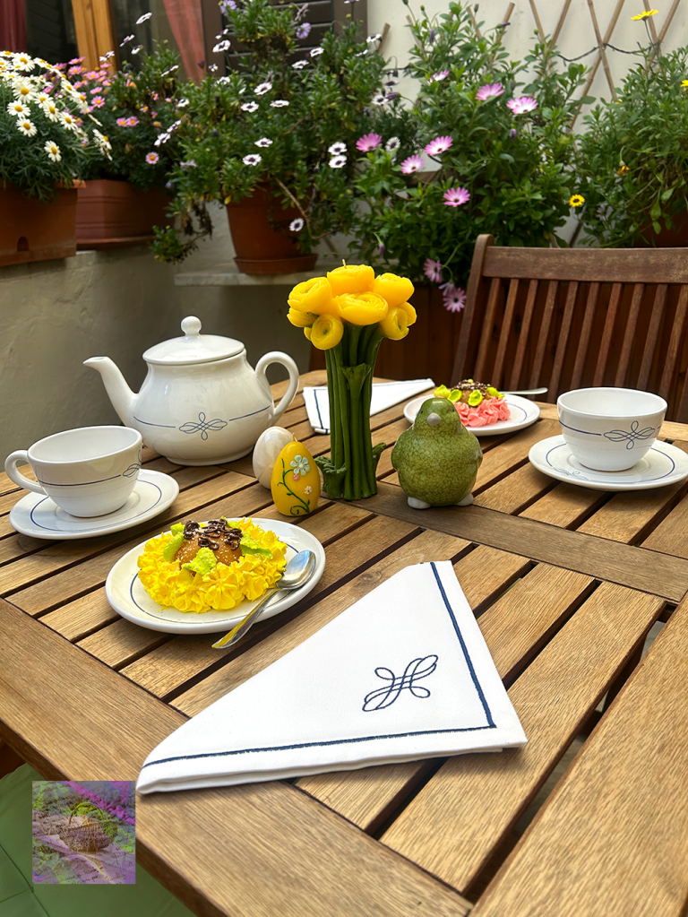 Nachmittagsspaß auf der grünen Terrasse. Diese bunten Mini-Cupcakes, die ich mit Pfirsichen gemacht habe, hatten großen Erfolg. Was denken Sie? Gelb oder Rosa? Haben Sie Vorschläge?