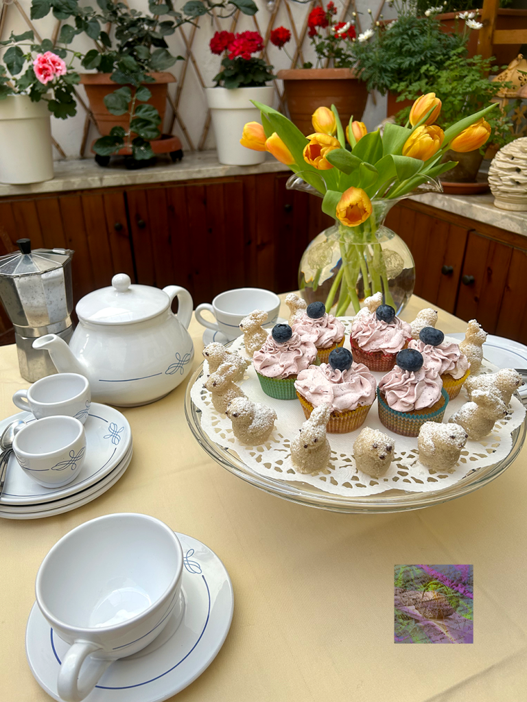Auf der grünen Terrasse – Eine Armee süßer Hasen und Küken aus Mandelpaste bewacht meine kleinen cremigen Blaubeer- und Karotten-Cupcakes für einen strahlend blauen Sonntagnachmittag im April. Ich wünsche allen einen guten Start in die neue Woche
