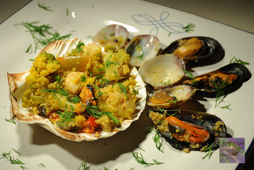 We like seafood but we are not used to eat it raw, so here we have an inviting tasteful dish we enjoy to cook and serve. It keeps the flavour of the sea and the lightness of vegetables: cous cous with crunchy vegetables, mussels, clams and scallops.