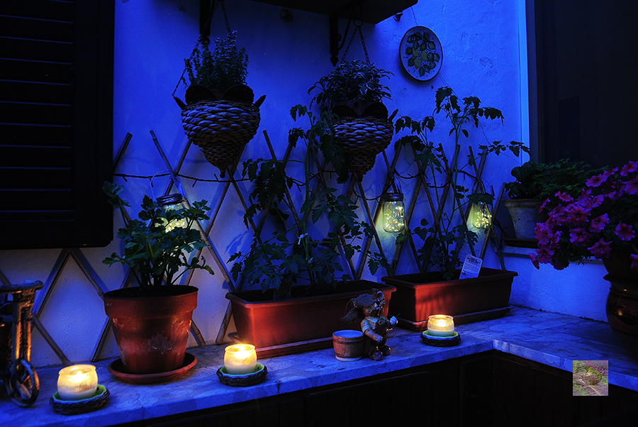 A bit of poetry in the green terrace tonight. The magic of beams of light in the jars illuminates the little growing plants of tomatoes. Soon, we are going to have sweet yellow tomatoes for our appetizers.