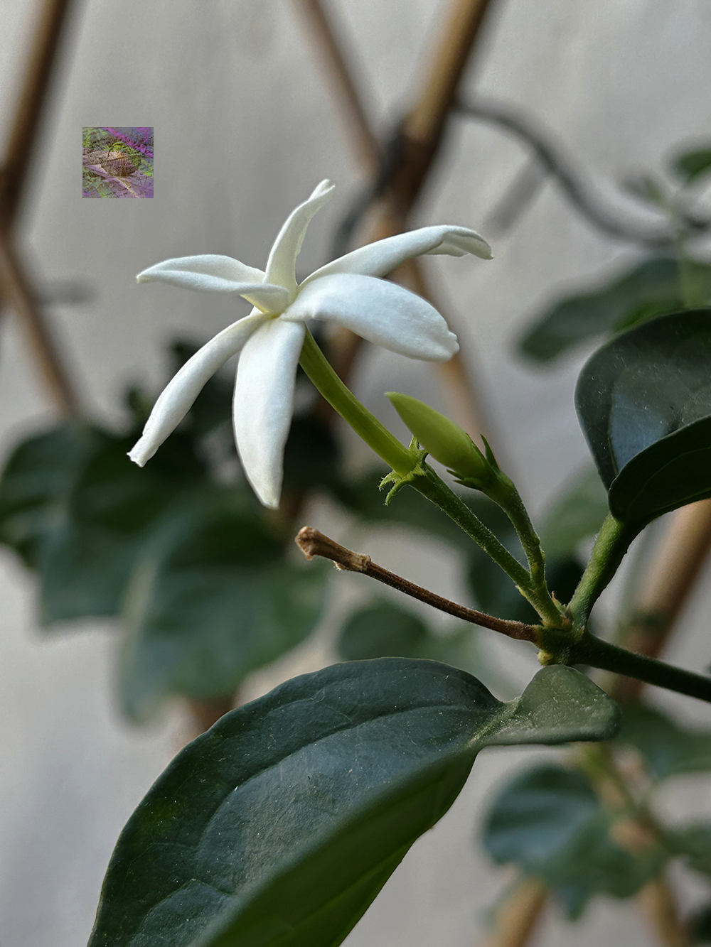 Climbing jasmine plants to be naturally intertwined with the old vineyard stakes that create spaces and flowerbeds