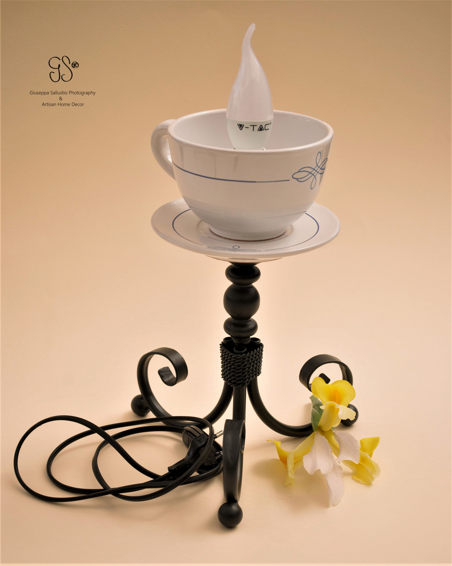 “Big Cup” – an elegant lamp made of white majolica ceramics and a blue ribbon as decoration. Handmade ironwork as a lamp holder. “Big Cup” can be a bright idea for a corner of your kitchen or your living room. Total height 30 cm, glass diameter cm 12, saucer diameter cm 16, 220-watt. Please, contact us and ask for more details about the specific product before setting the order. Thank you. The shipping is not inclusive in the total price. (1 in stock)
